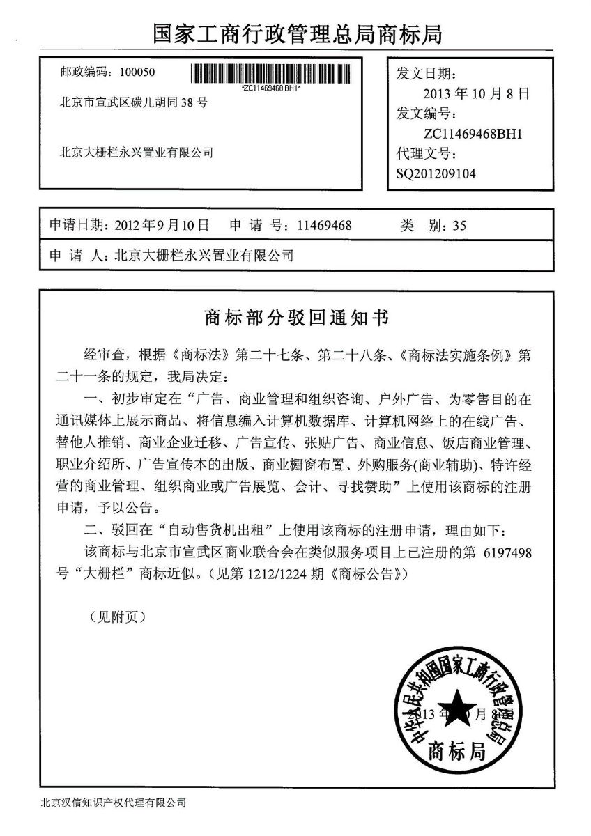 在永興置業(yè)申請(qǐng)的35類注冊(cè)“大柵欄圖形”商標(biāo)中除“自動(dòng)售貨機(jī)出租”這一項(xiàng)駁回,其余20項(xiàng)(1、廣告;2、廣告宣傳;3、計(jì)算機(jī)網(wǎng)絡(luò)上的在線廣告;4、戶外廣告;5、廣告宣傳本的出版;6、商業(yè)櫥窗布置;7、為零售目的在通訊媒體上展示商品;8、張貼廣告;9、商業(yè)信息;10、組織商業(yè)或廣告展覽;11、飯店商業(yè)管理;12、外購(gòu)服務(wù)(商業(yè)輔助);13、商業(yè)管理和組織咨詢;14、特許經(jīng)營(yíng)的商業(yè)管理;15、替他人推銷;16、職業(yè)介紹所;17、商業(yè)企業(yè)遷移;18、將信息編入計(jì)算機(jī)數(shù)據(jù)庫(kù);19、會(huì)計(jì);21、尋找贊助)已經(jīng)通過(guò)初審。