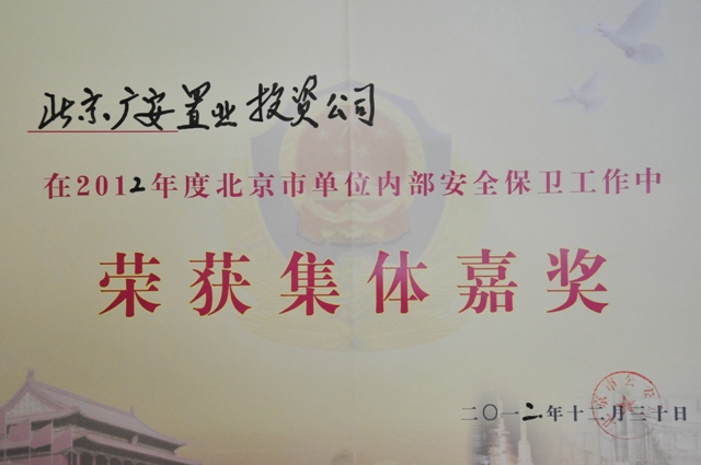 2013年1月10日,經(jīng)首都綜合治理辦公室和北京市公安局批準(zhǔn),北京廣安置業(yè)投資公司被授予“2012年度北京市單位內(nèi)部安全保衛(wèi)集體嘉獎”榮譽稱號。此稱號是北京市公安局對廣安置業(yè)在2012年度認(rèn)真落實治安保衛(wèi)工作制度,并在治安保衛(wèi)工作中取得顯著成績的肯定和表揚。