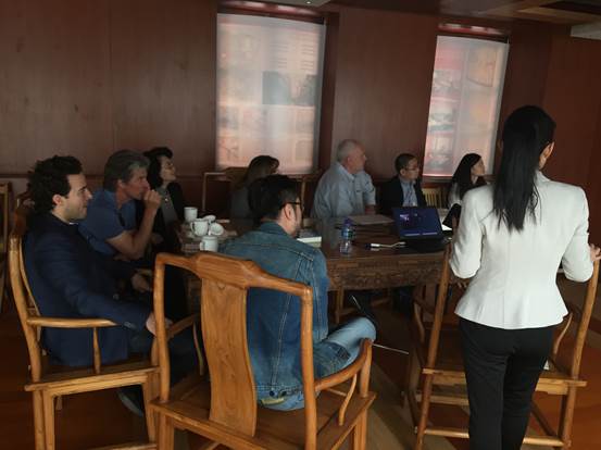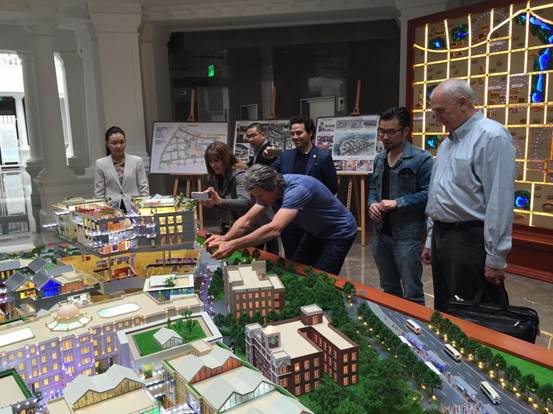 廣安置業(yè)營銷總監(jiān)沈紅梅一行向來訪人員介紹了項目的定位與特點,項目理念、設(shè)計細(xì)節(jié)以及富有民國特色的建筑風(fēng)格,得到了好萊塢電影大師的一致好評,紛紛饒有興趣的詢問相關(guān)信息、拍照留用。Jonathan Bollier表示北京坊項目令人驚艷,Phil Lengyel甚至開玩笑的表示希望能在北京坊擁有一間自己的辦公室。
