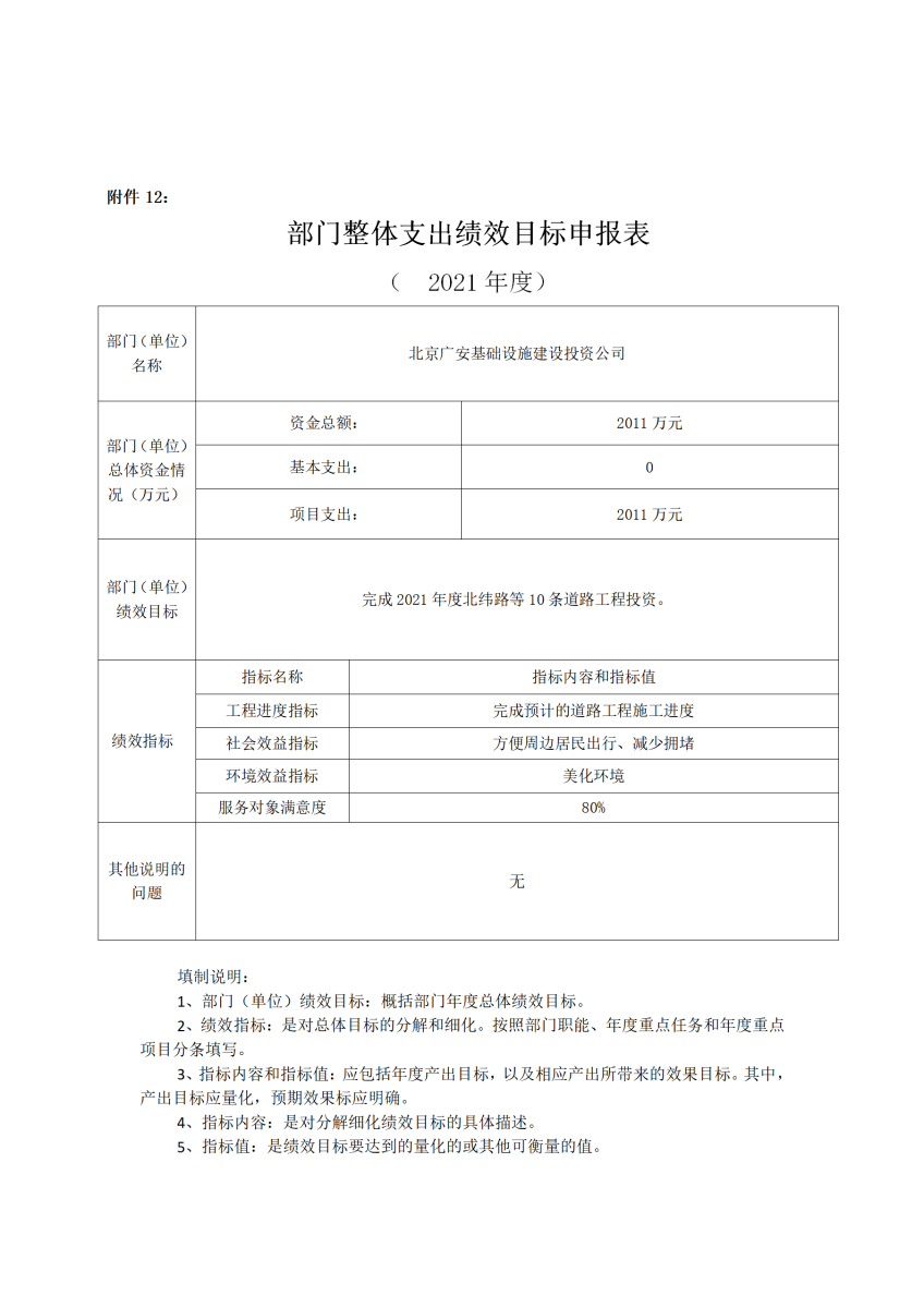 根據(jù)區(qū)發(fā)改資金安排及工程進(jìn)度,北京廣安基礎(chǔ)設(shè)施建設(shè)投資公司2021年總支出安排2011萬元,與2020年相比有所減少,原因是2020年預(yù)算中包含了需撥付西城區(qū)征收辦的征收資金。